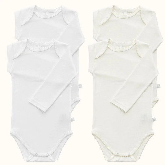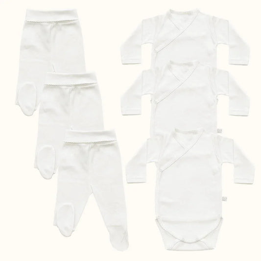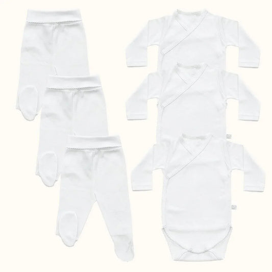 Kit Recém-Nascido em Algodão Branco – 3 Bodies + 3 Calças para Bebé Confortável